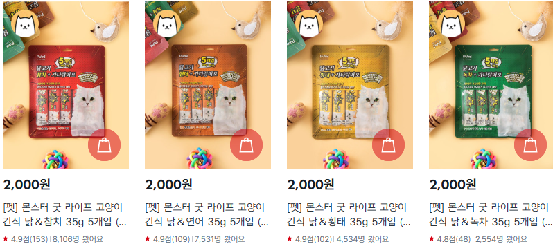 ✅ 인기 간식: 몬스터 굿 라이프, 냥이칩, 캣쮸 스틱, 이나바 테린 등